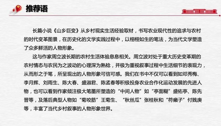 语言学及应用语言学专业的张若男同学从描写建国初期乡村发展的小说《山乡巨变》展开。她谈到小说从乡村现实生活经验取材,书写农业现代性的追求与农村的时代变革图景,在历史化的文学实践过程中,以栩栩如生的笔法,为当代文学塑造了众多鲜活的人物形象。反映的是中国人民建设新农村的问题,从中感受到了上个世纪中国人民建设社会主义的艰辛。