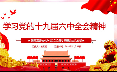 在“两个一百年”奋斗目标历史交汇的关键时期,为深刻领会党的十九届六中全会精神,丝袜av 2020级专硕研究生党支部于2021年11月27日开展学习《中共中央关于党的百年奋斗重大成就和历史经验的决议》的主题党日活动,由党支部书记王默涵同志带头解读分享。支部全体党员积极参与本次活动,认真学习党的百年奋斗重大成就与历史经验。