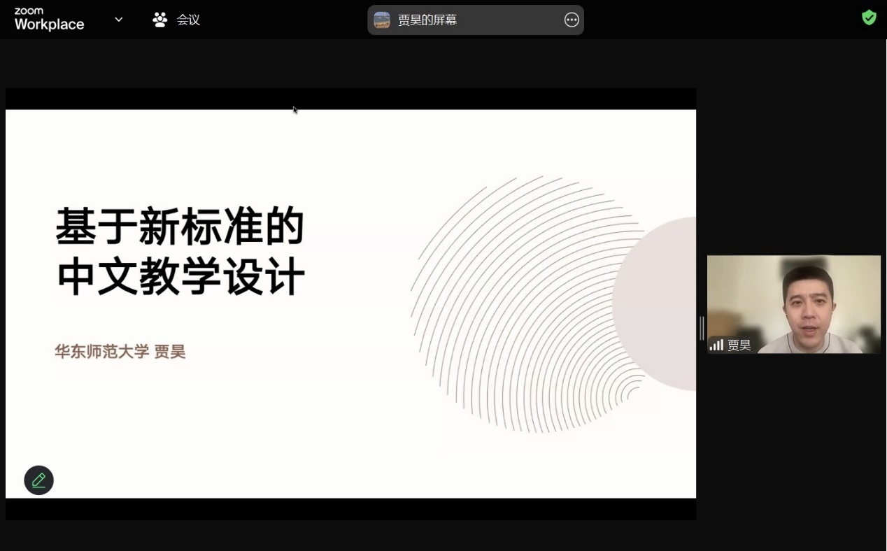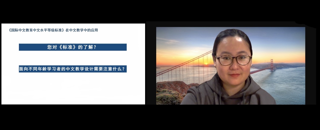 本次教学研讨工作坊共分为两个部分。第一部分由贾昊主讲,贾老师将新标准和欧框(CEFR)、美标(ACTFL)进行对比,突出新等级标准特点,结合中文教学情况,从三种类型的教学设计为例,为大家展示了新等级标准如何指导中文教学设计。