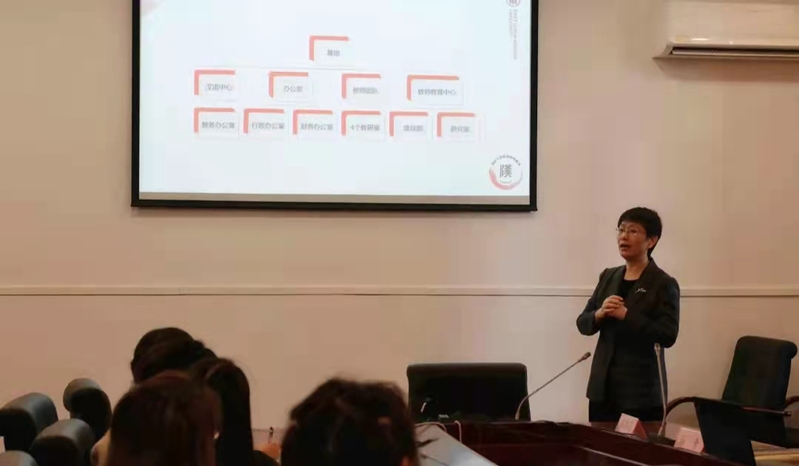 丁安琪老师介绍了基地机构调整后的总体架构,对新成员的加入表示热烈欢迎,同时宣布戴岚老师作为负责人投入基地的建设工作之中,马青老师任汉语中心主任、张蔚老师任教师教育中心主任。