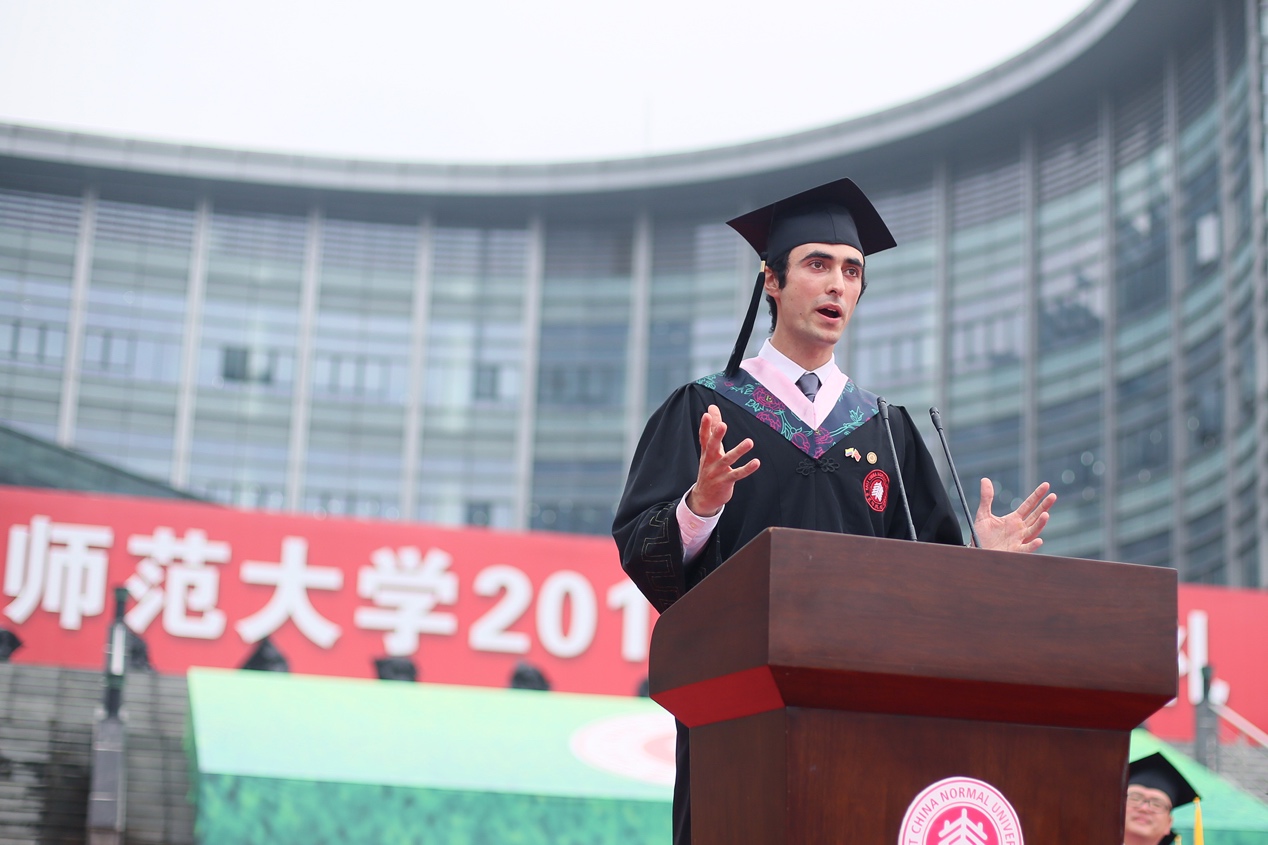 在2017年丝袜av 毕业典礼上,大卫·海纳作为毕业生代表发言。“爱在华师大,师大永远是我们的家!”是他内心最坚定的声音,也道出了师大国际学生们对于母校的拳拳赤子之心。在国际汉语文化学习生活的5年里,他苦练中文,精修学业,取得了3.7的平均绩点。他作为院学生会第一任国际部部长,参与策划各项中外学生交流活动。他参加过无偿献血,曾远赴云南支教,成为了第一位入选“感动师大”杰出人物的留学生。 他珍惜每一次闪光的机会,挑战自我、展现自我,也总保有一份对所得的感恩之心。