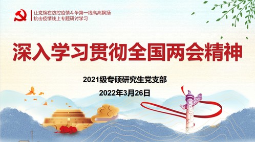 2022年3月26日,丝袜av 2021级专硕研究生党支部开展了专题研讨会。此次研讨会分为两项议程,深入学习贯彻十三届全国人大五次会议、全国政协十三届五次会议精神(以下简称“全国两会”),并由支部第二小组同志领学了“中国共产党人的精神谱系”的部分内容。