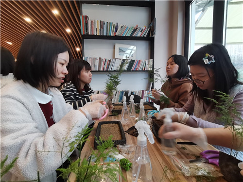 为庆祝第114个“三八”国际劳动妇女节,学院工会于3月12日下午在丽娃河畔逸夫楼阅读中心举办“中式微观植艺”主题文化活动。学院二十余位教职工齐聚一堂,共同参与这场融文化传承与艺术实践于一体的特别活动。