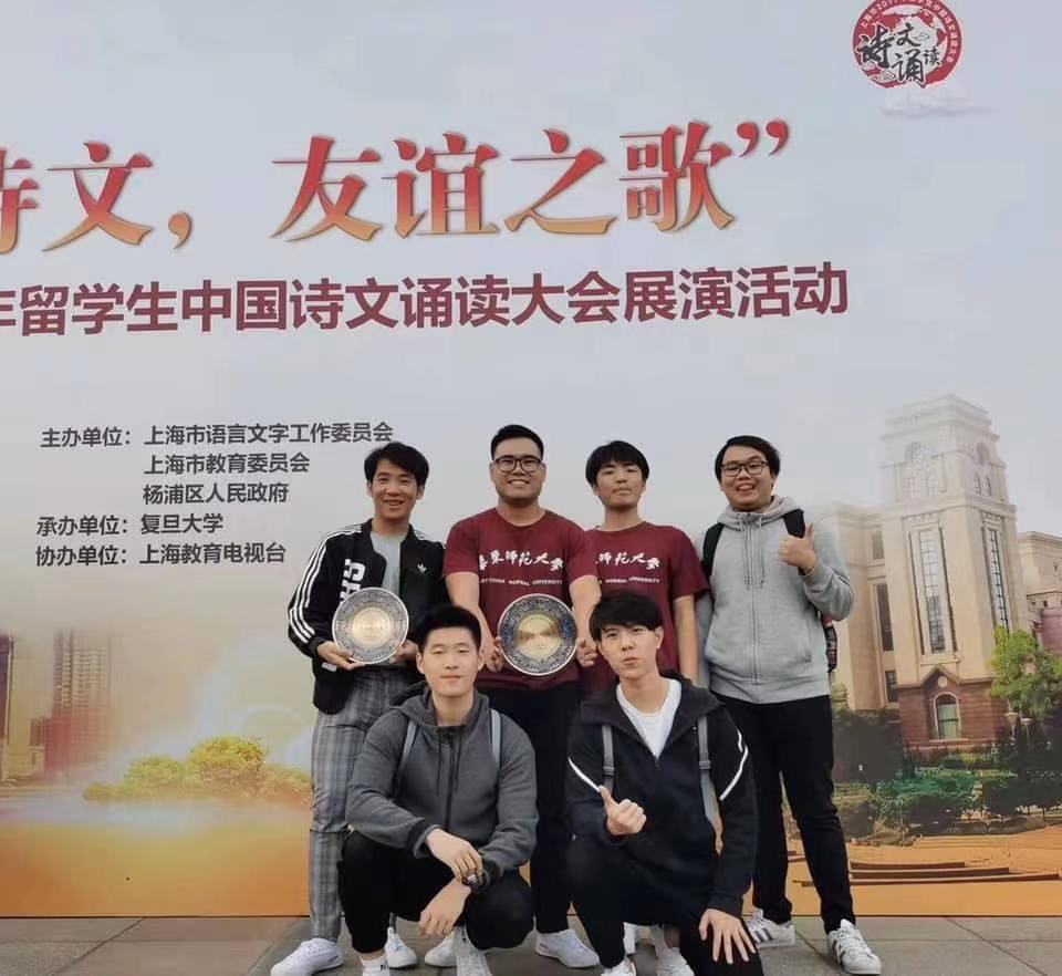 蔡小彬在本科期间参加了上海外国学生中国诗文诵读大会活动。他和另外三个泰国学弟一起参加集体赛,日复一日的训练也让他们慢慢地成为了“铁哥们儿”。蔡小彬说,朗诵比赛不仅提高了汉语水平,也增进了友谊,让我们师兄师弟关系日益密切。当然,作为华师大的学子完成任务得双赢,我们不仅享受了欢乐的过程,同时还享受了结果,当时我们获得了人气奖(相当一等奖)。
