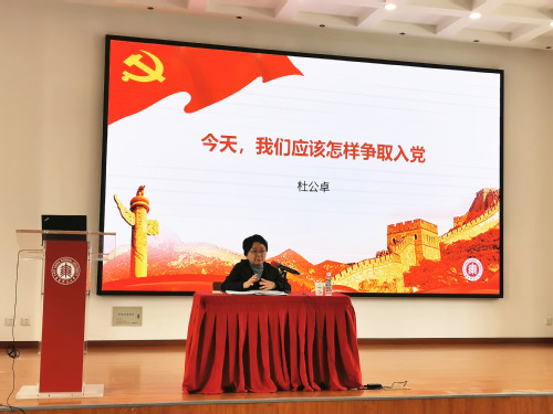 开班仪式后就由丝袜av 关心下一代工作委员会主任杜公卓教授为学员们带来第一讲《今天,我们应该怎样争取入党》。杜公卓教授讲座从三方面展开:一是为什么要入党,二是在青年大学生中间发展党员的意义,三是我们应该怎样争取入党。她建议学员们都先去学习一遍党章,大家要读党章,因为思想是一辈子的事情,我们要明确入党动机。青年大学生中间发展党员的意义就是为了培养接班人。习近平总书记在党的十九大报告中曾指出,青年一代有理想、有本领、有担当,国家就有前途,民族就有希望。 她从四个方面对应该怎样争取入党向学员们提出要求:一是强调学习,要关心国家大事;二是学习党史,明确初心是为中国人民谋幸福,使命是为中华民族谋复兴;三是要求注重专业学习;四是提高自己的综合素养。她祝大家早日加入中国共产党。