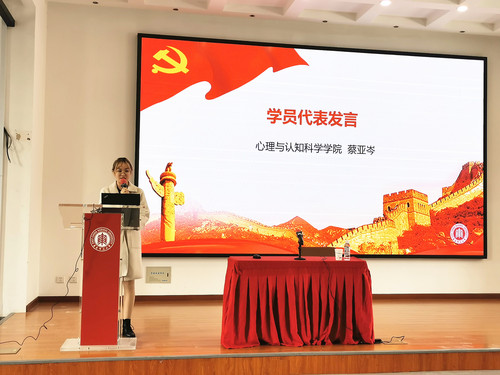 最后,心理与认知科学学院蔡亚岑作为学员代表发言。她感谢此次党校的宝贵机会,今年是建党100周年,未来的道路需要年轻一代去谱写新的篇章,作为入党积极分子,要珍惜这次机会。
