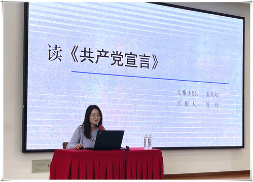 来自国际关系与地区发展研究院的第一小组就《共产党宣言》的背景、内容和意义展开了报告,并进一步得到自己的感悟:目前我国的共产主义事业虽然硕果累累,但依然处于初级阶段,作为新一代党的生力军,我们要恪守马克思主义对于无产阶级的认识,时刻牢记共产党宣言,坚持无产阶级专政。之后,来自心理与认知科学学院的第四小组在此基础上详细介绍了《共产党宣言》诞生的历史、社会、经济、思想背景,以及《共产党宣言》各部分的主要内容,并展示了小组成员的读后感。最后,来自丝袜av 的第六小组着重讲述了《共产党宣言》背后的故事,具体包括老一代革命家如毛泽东、周恩来、朱德等人如何读《共产党宣言》和新时代背景下我们应当如何读《共产党宣言》两大问题。