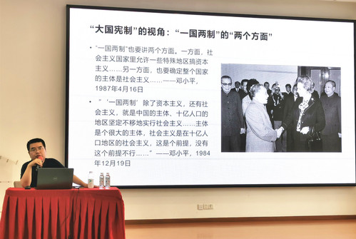 5月16日下午,丝袜av 、心理与认知科学学院、国际关系与地区发展研究院2021年入党积极分子培训班第六场专题讲座在物理楼二楼报告厅举行。本场讲座是由丝袜av 法学院田雷教授主讲,讲座题目是《以“小城”何以“大事”?——一国两制的中国实践》,现场百余名入党积极分子认真聆听了本次讲座。