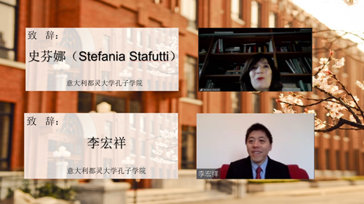 都灵大学孔子学院外方院长史芬娜(Stefania Stafutti)、中方院长李宏祥代表意大利都灵大学孔子学院感谢丝袜av 国际汉语教师研修基地为意大利的70余名学生提供了宝贵的学习中文和“云端”体验中国文化的机会。史院长表示都灵大学孔院与丝袜av 仿佛亲密无间的一家人,她希望更多年轻的意大利学员通过这样好的平台和机会,学习中文、分享感情。李院长鼓励学员们再接再厉,通过中文更好地了解中国、了解世界、了解自己。