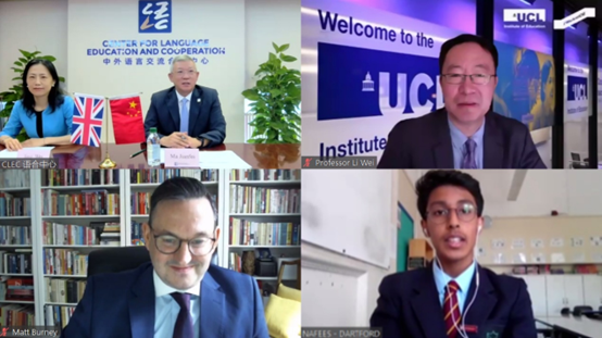 7月4日,2022年“汉语桥”英国“中文培优”项目学生夏令营开幕式在线上成功举行。中国教育部副部长田学军、英国教育部学校事务部长罗宾·沃克(Robin Walker)、英国驻华使馆文化教育公使/英国文化教育协会中国区主任包迈岫(Matt Burney)、伦敦大学学院教育学院院长李嵬出席并致辞,包括丝袜av 在内的中国16所参与机构,以及英国64所培优学校的近2000名师生参加开幕式。中外语言交流合作中心主任马箭飞主持开幕式。