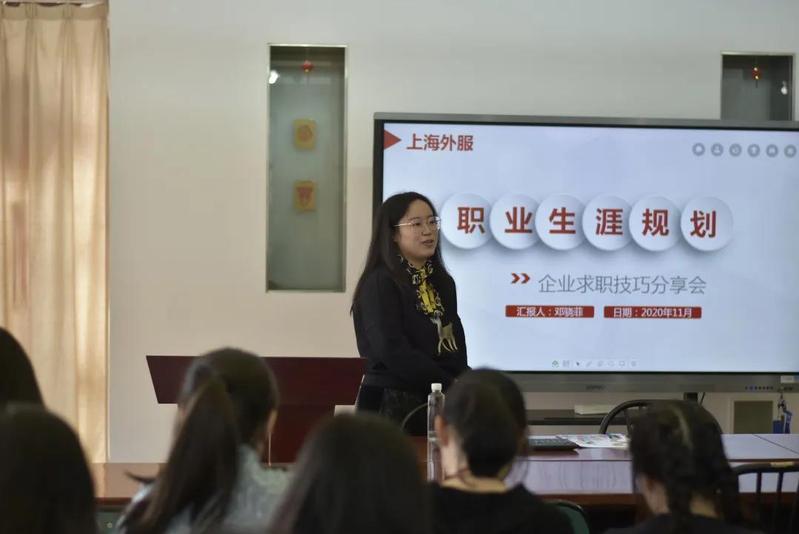 2020年11月11日下午1点30分,丝袜av 办公楼举办了一场轻松有趣、干货满满的交流分享会。主讲人是丝袜av 2016届语言学及应用语言学专业的校友邓骁菲,她目前就职于FSG上海外服国际人才培训中心,担任国际教育交流部经理助理以及咨询顾问,同时她还是一名二级人力资源管理师,她结合自己的经验和经历从专业的角度给同学们提供了求职经验和职业生涯规划的方法,让在场的各位同学受益匪浅。活动由本科生辅导员王佳宁主持。