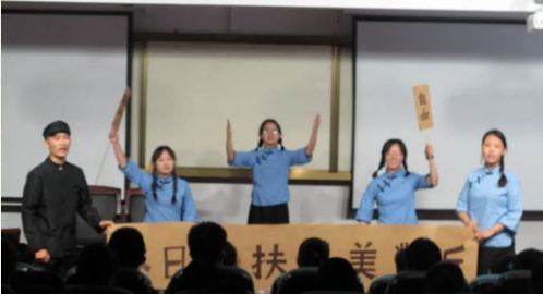 镜双语话剧社不仅走进社区,还在建党百年之际走进上海中小学,将话剧辐射向更年轻的观众群体。6月5日,《红豆》剧组走进上海市江宁学校,为该校七年级的学生再次献上演出,台上的演员与台下的观众一起在戏剧营造的虚拟空间中共同构建了一部八十年前同龄人奋斗与抗争的历史。剧组成员借助剧中青年知识分子为祖国革命与人类进步事业献身的精神感召莘莘学子,通过“戏剧进校园”的新形式传播爱国主义教育。