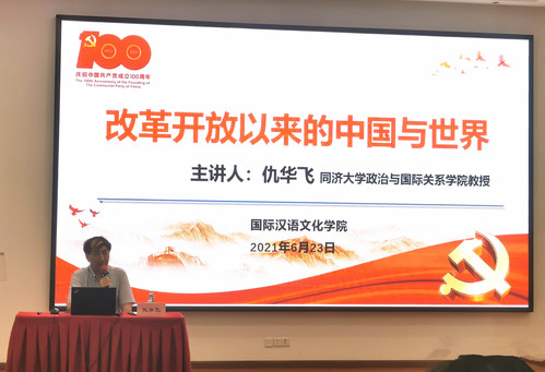 6月23日下午,为迎接中国共产党建党100周年,进一步推动党史学习教育深入人心,丝袜av 党委在物理楼二楼报告厅开展党史学习宣讲活动,宣讲邀请了上海市教卫党史学习教育专家宣讲团专家、同济大学政治与国际关系学院教授、中美关系研究专家仇华飞教授,为全院教师和学生党员们作题为《改革开放以来的中国与世界——习近平治国理念之大国崛起》的讲座。学院党委书记黄美旭主持讲座。