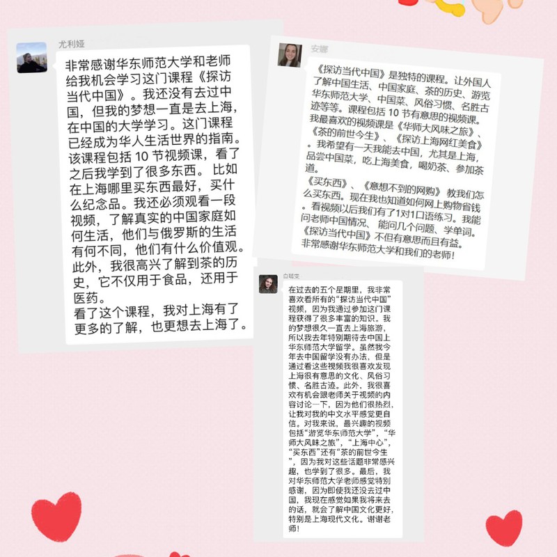 白璐雯(英国):在过去的五个星期里,我非常喜欢看所有的录播课视频。因为我通过参加这门课程获得了很多知识。我的梦想一直是去上海旅游,所以我也特别期待能够去丝袜av 留学。通过看这些视频,我发现上海很有意思。此外,我很喜欢和老师聊天。因为他们很热情,让我对我的中文更加自信。谢谢老师们!
