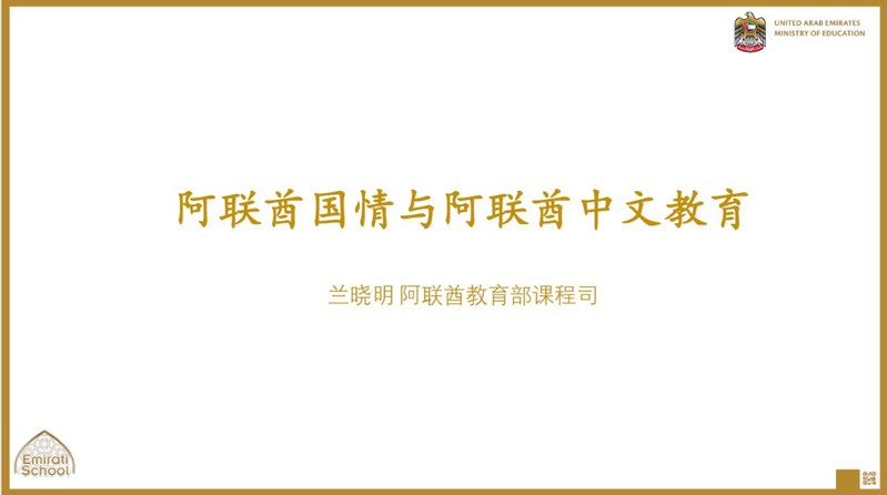 兰晓明博士从阿联酋教育国情和教育体系入手,详细说明了阿联酋中小学教育制度及课程设置情况,特别引入了阿联酋当前的网络教育体系和线上教学情况。兰晓明博士重点介绍了当今阿联酋教育部的中文课程实施发展历程、中文课程框架、HSK考试、中文教师培训等情况。目前基地与阿方合作有《跨越丝路》中文教材的编写、多期中文教师岗中、岗前培训等项目,就是在现阶段的中文教育基础之上,进一步推动阿联酋中文教育建设,培养优秀的、高层次的阿联酋中文教师,满足阿联酋日益增长的汉语学习需求。这也是双方在中阿两国就2019年签署的《关于将汉语纳入阿拉伯联合酋长国中小学教育体系的谅解备忘录》基础上的共同努力。