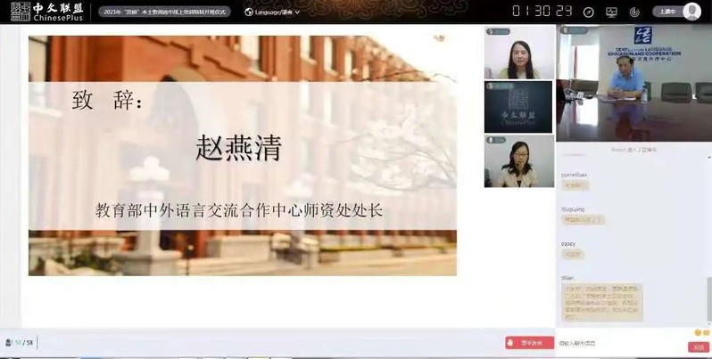 本土汉语教师岗中培训开班仪式在华东师大国汉基地汉语教师培训中心主任戴岚的主持下正式开始。在开班仪式上,教育部中外语言交流合作中心师资处处长赵燕清发表致辞。他首先对本土汉语教师表示了热烈的欢迎,并指出“一带一路”沿线国家的国际汉语教育事业发展离不开本土汉语教师的推动。“汉硕”本土汉语教师立足自身文化,同时对中国与中华文化有着相当的了解,因此对促进国与国之间的理解与沟通具有举足轻重的地位。特别是在新冠肺炎疫情期间,很多本土汉语教师在艰难的环境下砥砺前行,为当地的汉语教学工作做出了有目共睹的贡献。最后,他希望“汉硕”本土汉语教师能够通过此次培训对汉语教学与中华文化有更深入的了解,预祝此次培训圆满成功,并期待来年能够在华东师大线下再次相见。