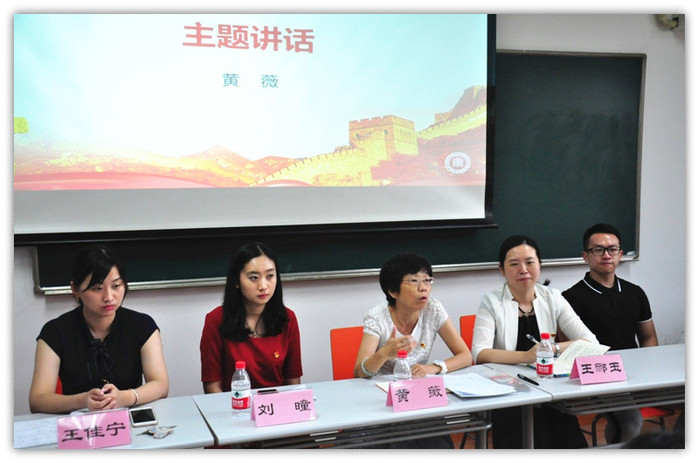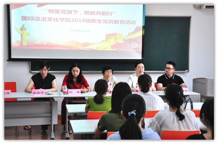 2018年9月14日下午两点,丝袜av 党委在国际汉语教学楼315教室举办了以“相聚党旗下,砥砺共前行”为主题的2018级新生党员教育活动。丝袜av 党委书记黄薇、党委副书记兼副院长王郦玉、本科生辅导员兼本科生党支部书记刘曈、研究生辅导员兼2016级研究生党支部书记王佳宁、研究生辅导员吴晓隆、2017级研究生党支部书记邢增煌、学院全体2018级新生辅导员参加了本次活动,活动由王郦玉主持。