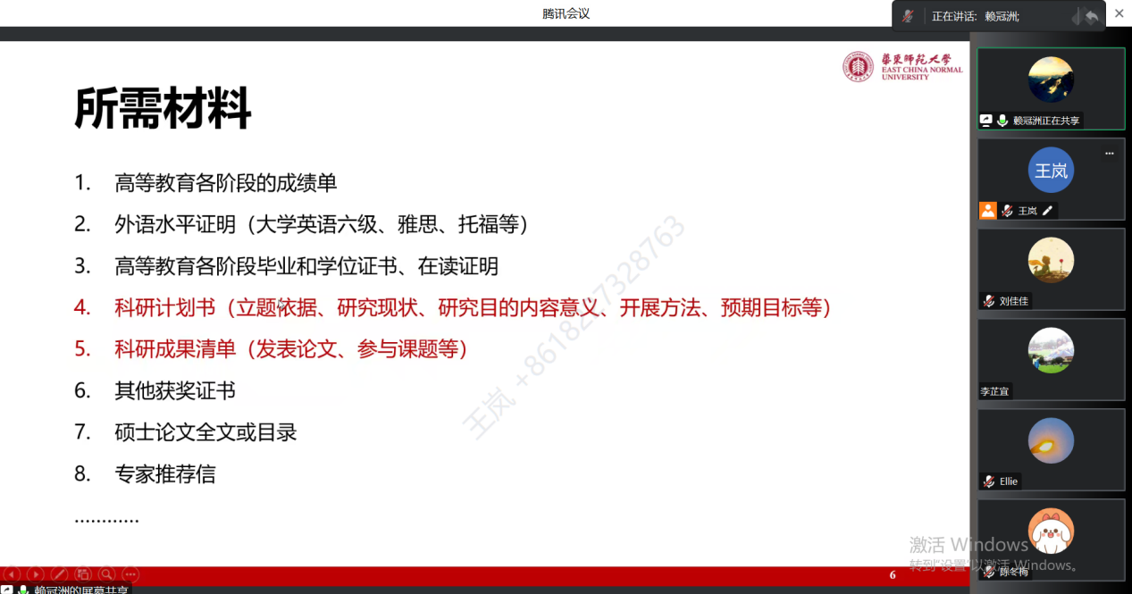 20级毕业生党员赖冠洲分享了复旦大学中文系的申博经验,他从申博流程、所需材料和个人建议三方面总结了申博技巧。此外,他提出联系导师在博士申请过程中是十分必要的,可以提前了解目标导师本年度的招生情况和研究方向,为申博提供充分的参考。