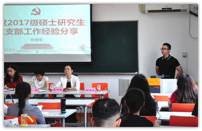 接着,邢增煌分享了他在学生党支部工作的经验。他从支部情况、支部工作和工作建议三个方面着眼,不仅用生动的图片介绍了学院学生党支部组织开展的各项工作,而且还提出了几个中肯的建议。他希望新生党员同学们能够明确党员身份,履行应尽义务;发挥党员的积极性、主动性;做更优秀的自己。